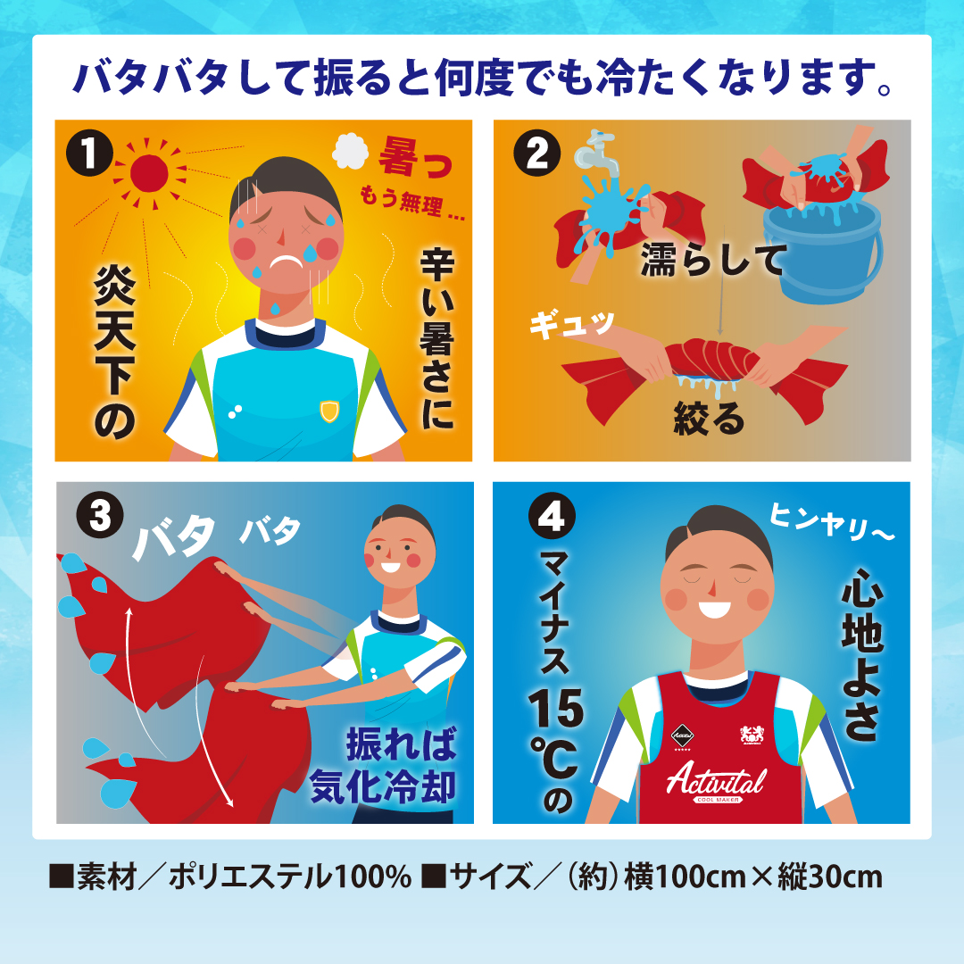 COOL MAKER冷却タオルは濡らして絞り、振るだけで生地が-15℃※1の冷感を発揮します。UVカット率99%※2で、強い日差しからもしっかりガード。夏のスポーツを頑張るお子様を熱中症から守りたい親御さん、暑さと戦うアスリートのパフォーマンス維持に最適!試合前後のアイシングやクールダウンにも大活躍。プレーヤーだけでなく、熱中症やUVダメージを防ぎたいすべての方におすすめです。