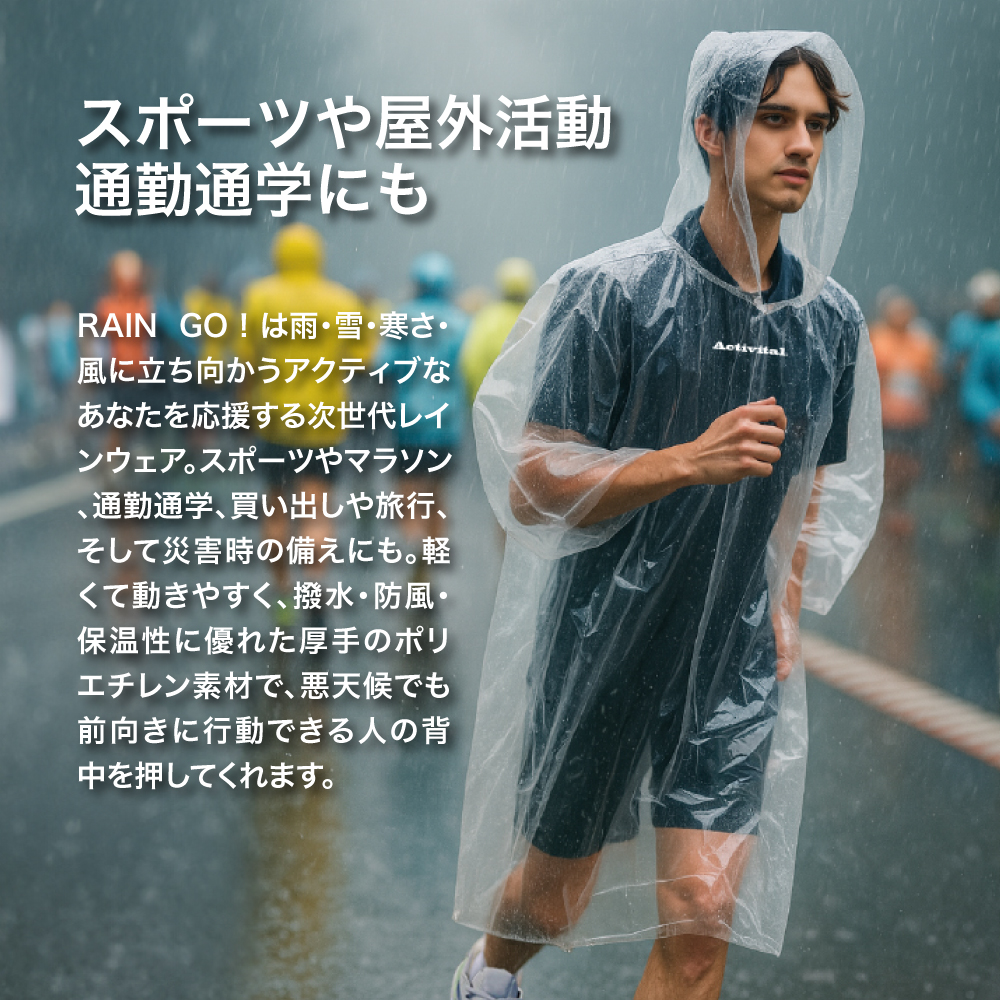 RAIN GO ! は雨・雪・寒さ・風に立ち向かうアクティブなあなたを応援する次世代レインウェア。スポーツやマラソン、通勤通学、買い出しや旅行、そして災害時の備えにも。軽くて動きやすく、撥水・防風・保温性に優れた厚手のポリエチレン素材で、悪天候でも前向きに行動できる人の背中を押してくれます。