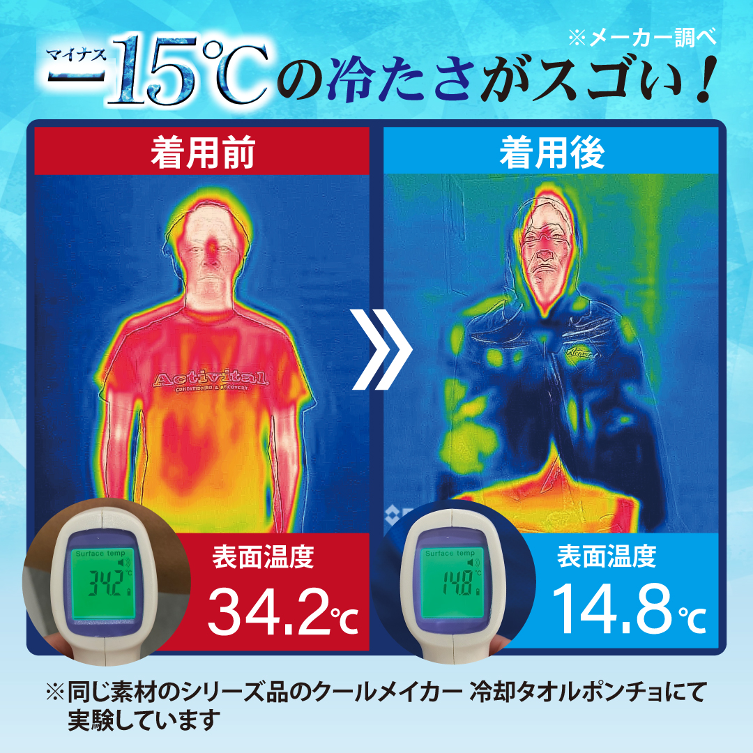※1 -15℃の極冷体感は社内検査の結果、11名のモニター全員の皮膚表面温度と気化冷却状態の製品表面温度の差が15℃以上を記録し、使用者があまりの冷たさに驚いた事実から表示しています。