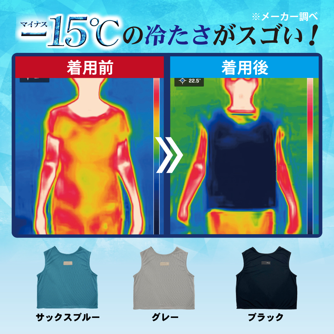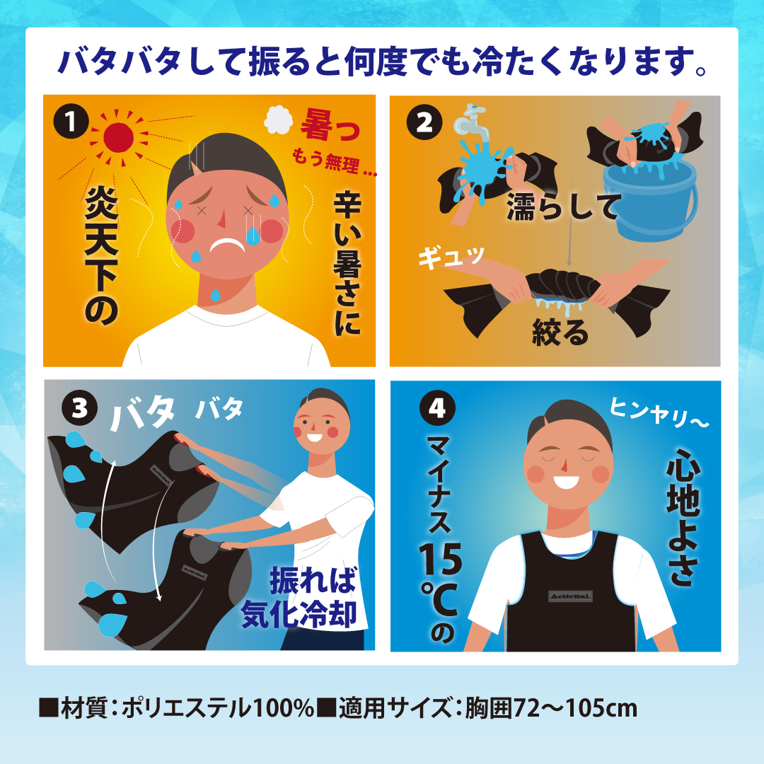 ※1 -15℃の極冷体感は社内検査の結果、11名のモニター全員の皮膚表面温度と気化冷却状態の製品表面温度の差が15℃以上を記録し、使用者があまりの冷たさに驚いた事実から表示しています。